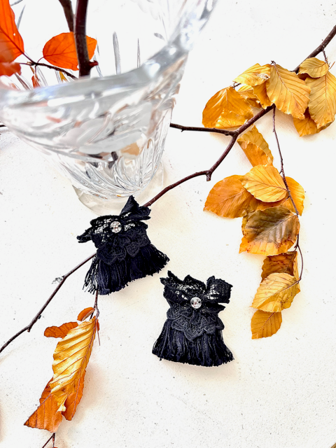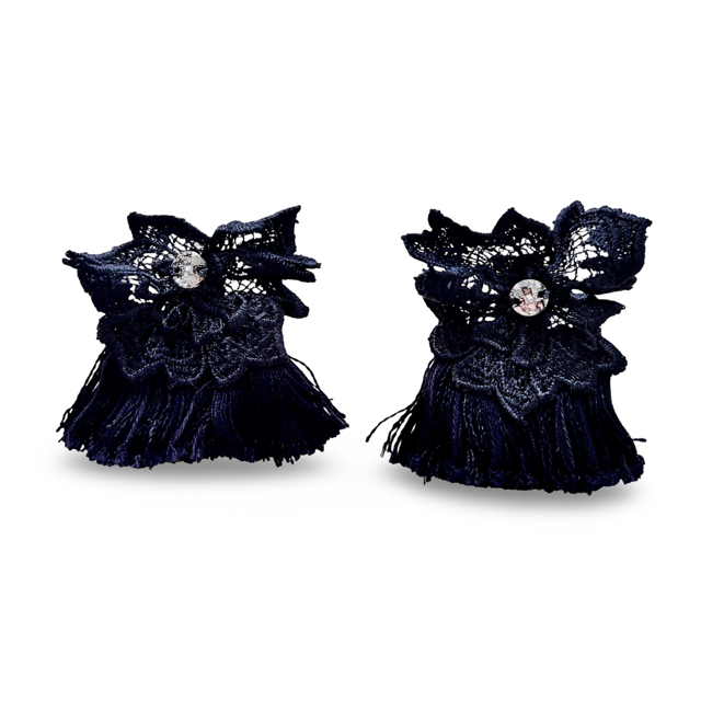 *Aretes románticos,flores en guipure y flecos en algodón, cristal con acabado matizado en negro y transparente lo que le aporta un aire de ensueño a esta hermosa pieza , llévalos tanto de día o de noche tú decides .