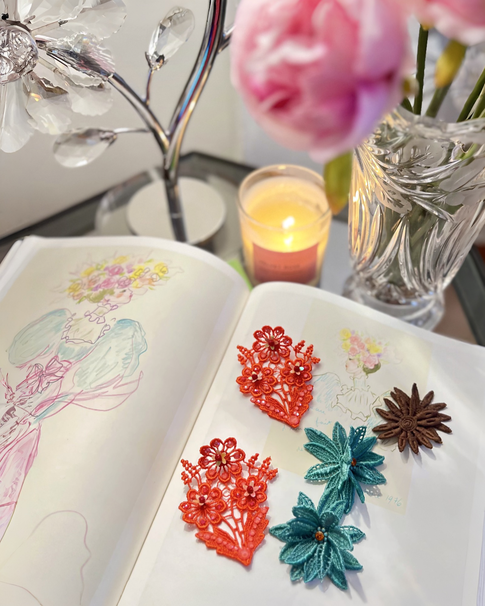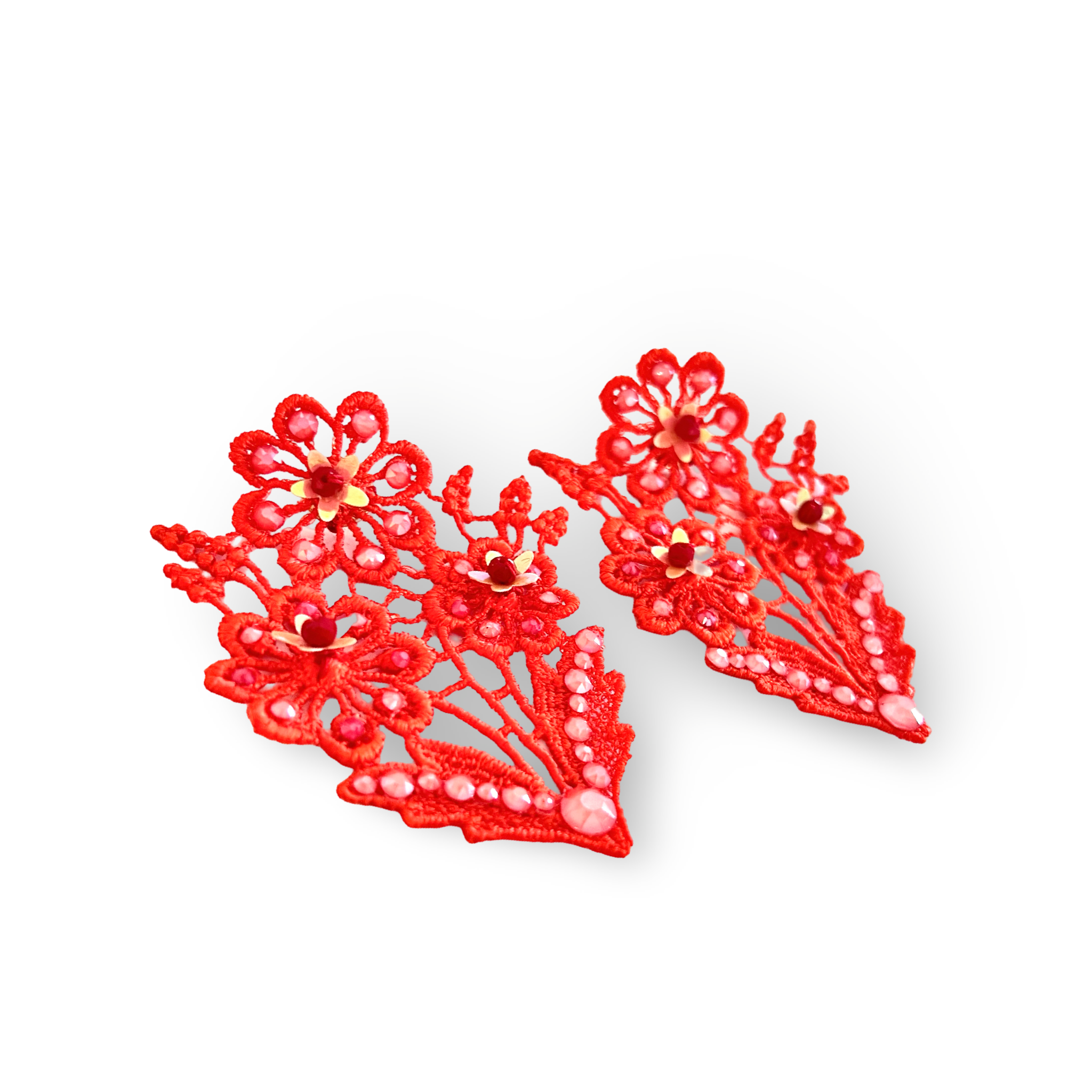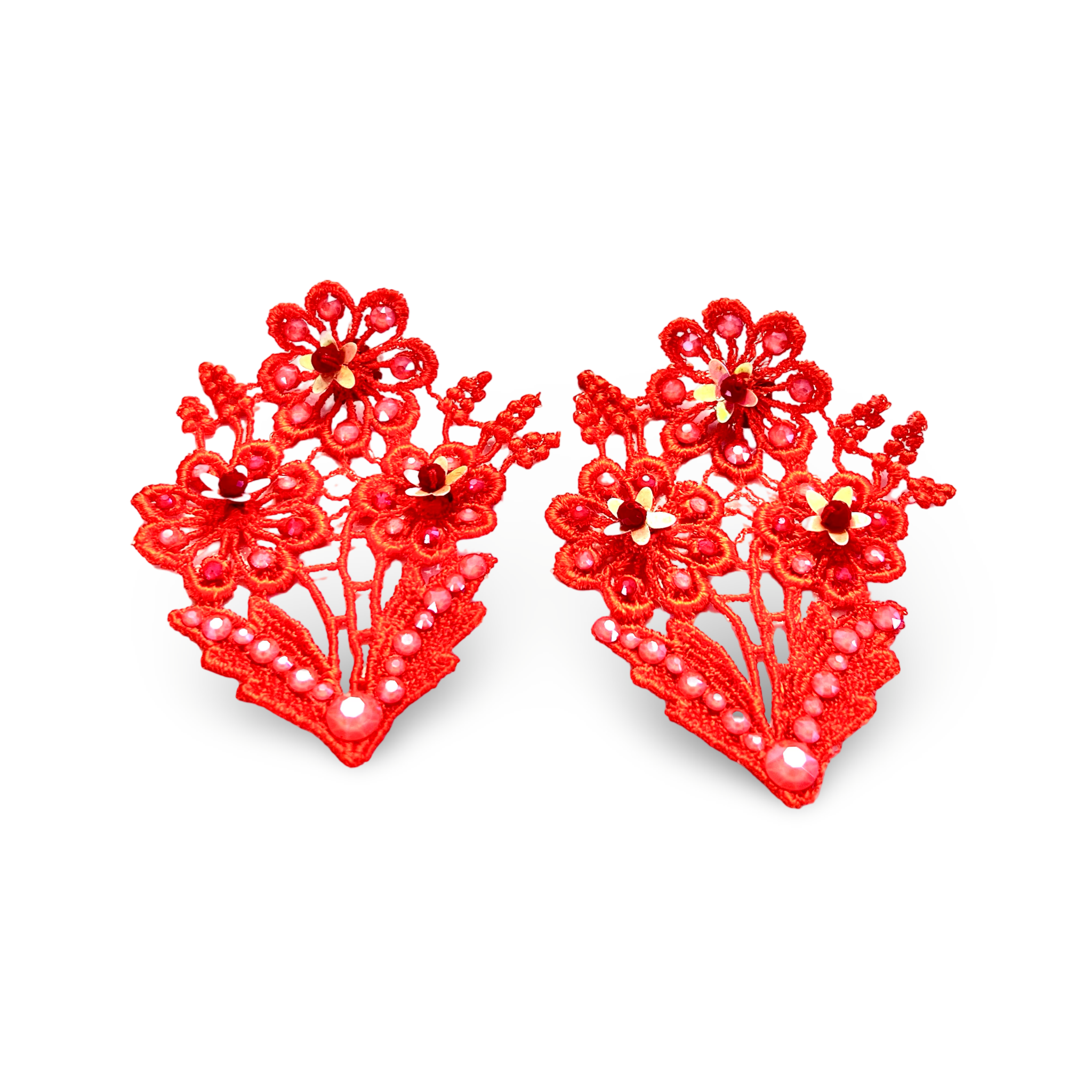 - Lentejuelas en forma de flor, bordadas en su centro con una piedrita facetada